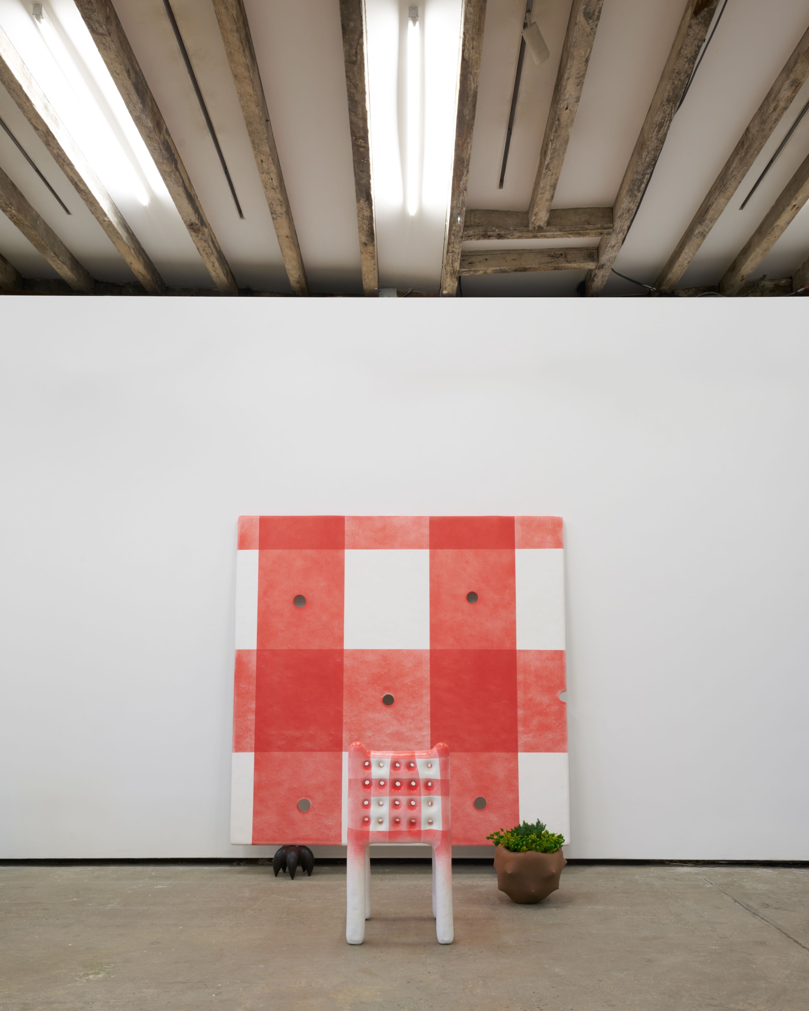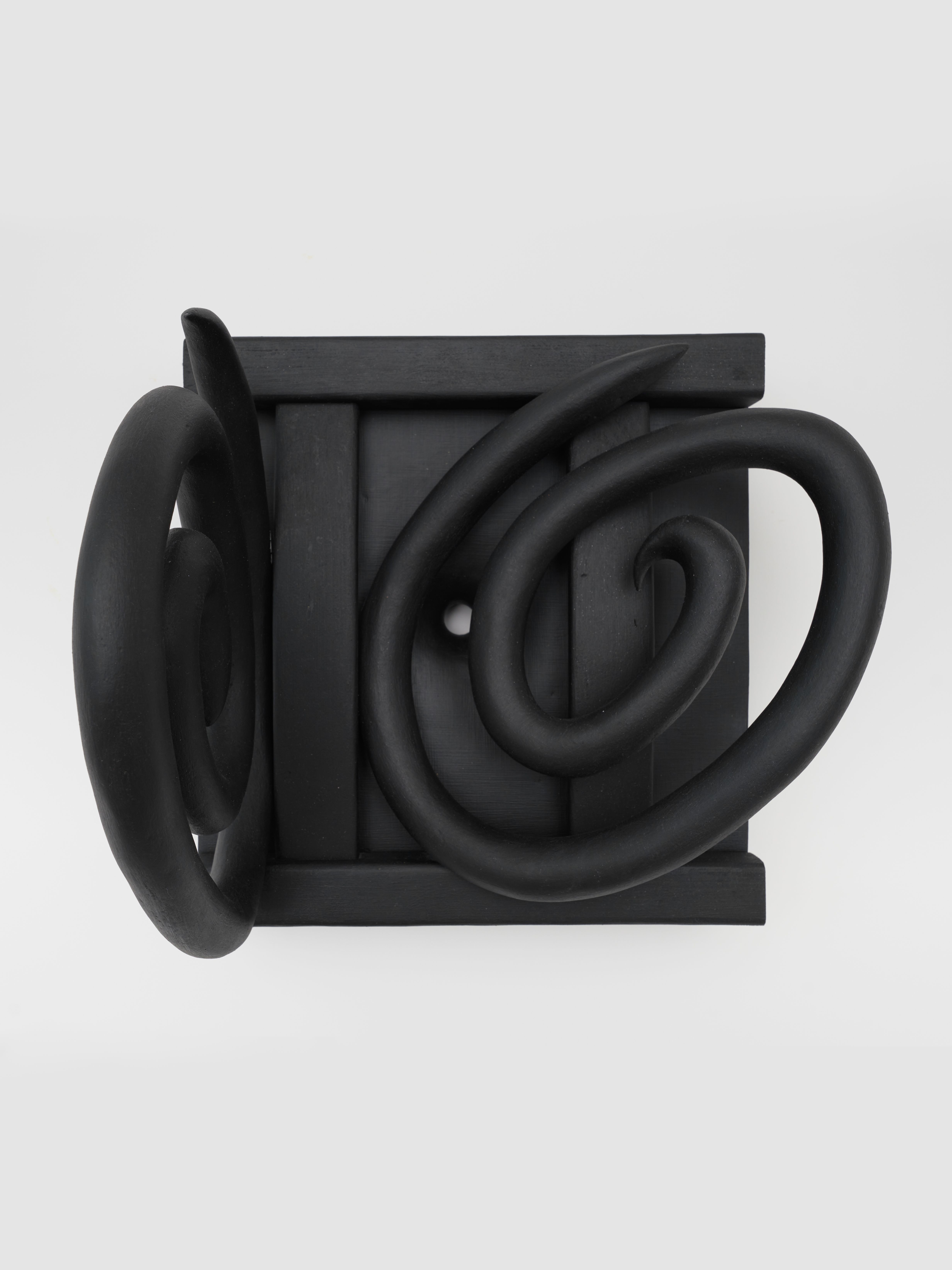 Holes and baskets are everywhere in the wall works. Their surfaces come in shades of shellfish, mouse gray, and gingham red. Each wall work has the option to rest upon claw-like jet-black footrests. The footrests resemble deep sea bottom dwellers; Barger calls them his “crustaceans.” He explains that they reify parts of our “shadow selves” that emerge from the inside-out, horny for organic possibility and abnormal growth. They exist to displace, with what Susan Sontag might call “the irrational indulgence of desire.” The claws give the work a spritely feel. There’s a sense that at any moment these totemic creatures might scamper off from fear of their fortuitous, fertile meaning.