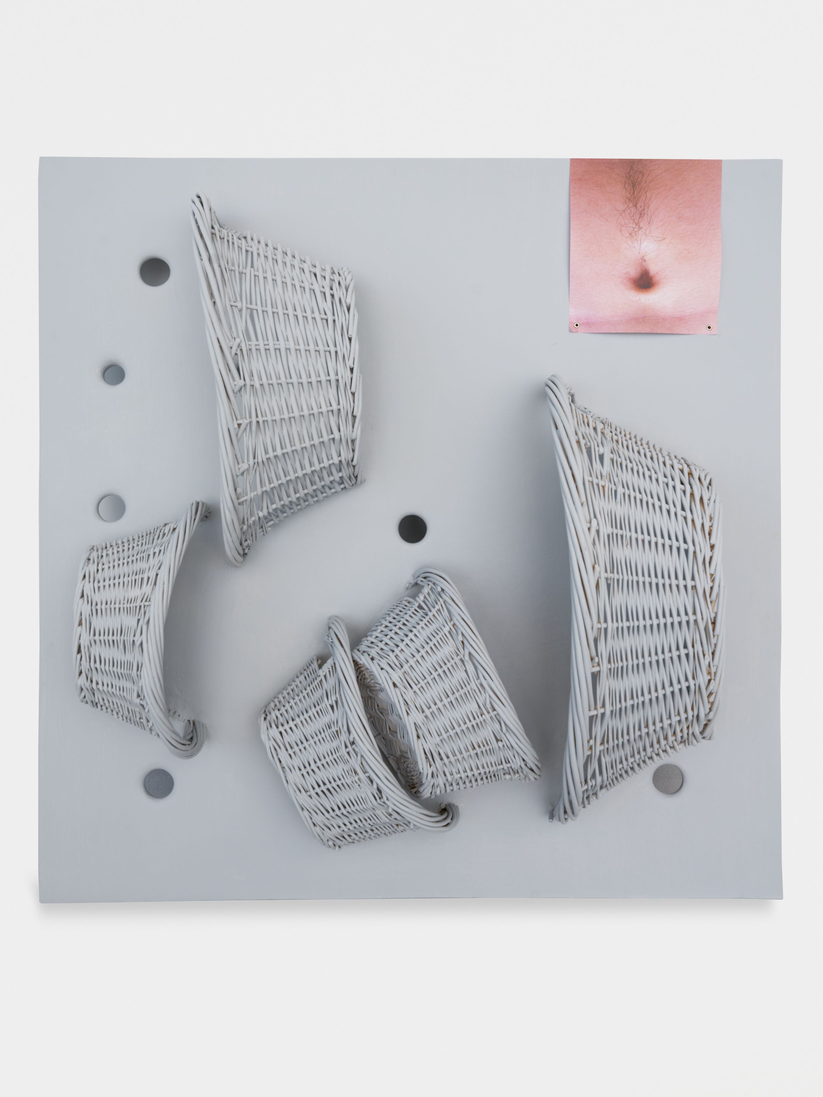 Recently, some cavities have baskets fitted inside them and others have been transformed into peepholes. Take a look inside one of his peepholes and you’ll be met with a photograph of a taut tummy and a fuzzy navel. Baskets can hold fruits and wools. Fuzzy navels take a lover’s fruit juices or wool crumbs. The happy trails are sweet spots for our eyes to find something firm and warm after so much fingering around in the hole-y unknown. Sure, you are only given a little flesh to rest your eyes upon but a tummy might be a nice place for a lover to find refuge after so much exploring.