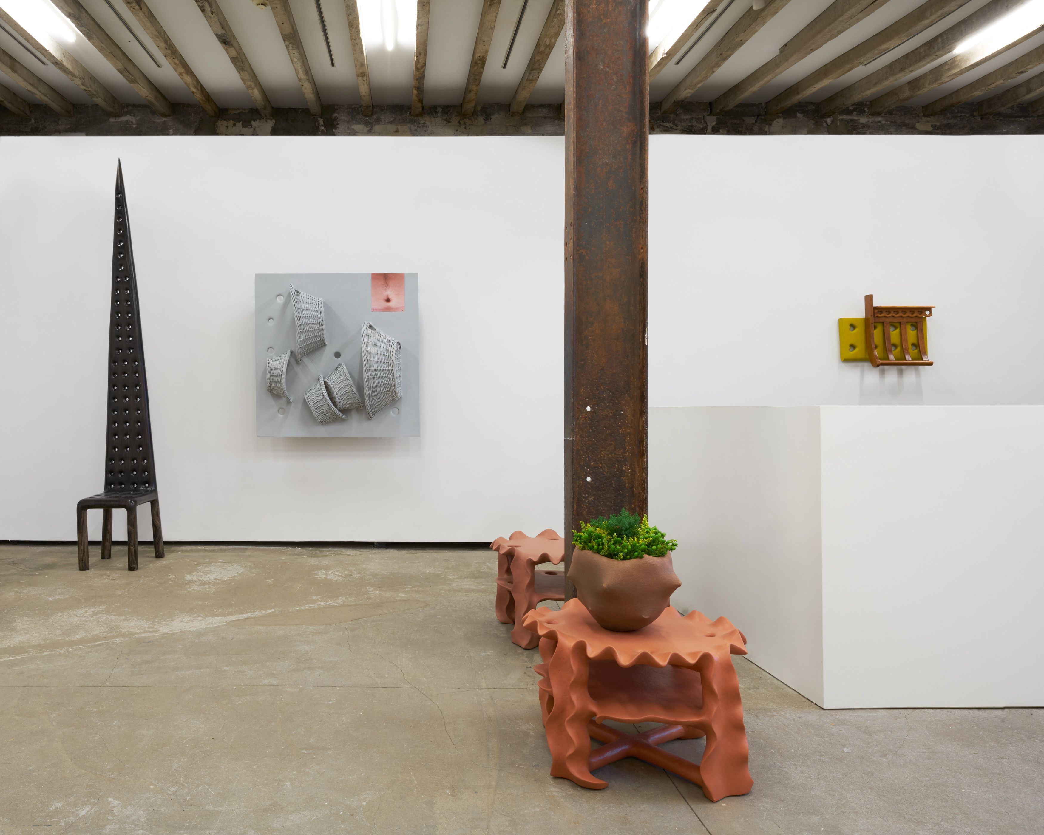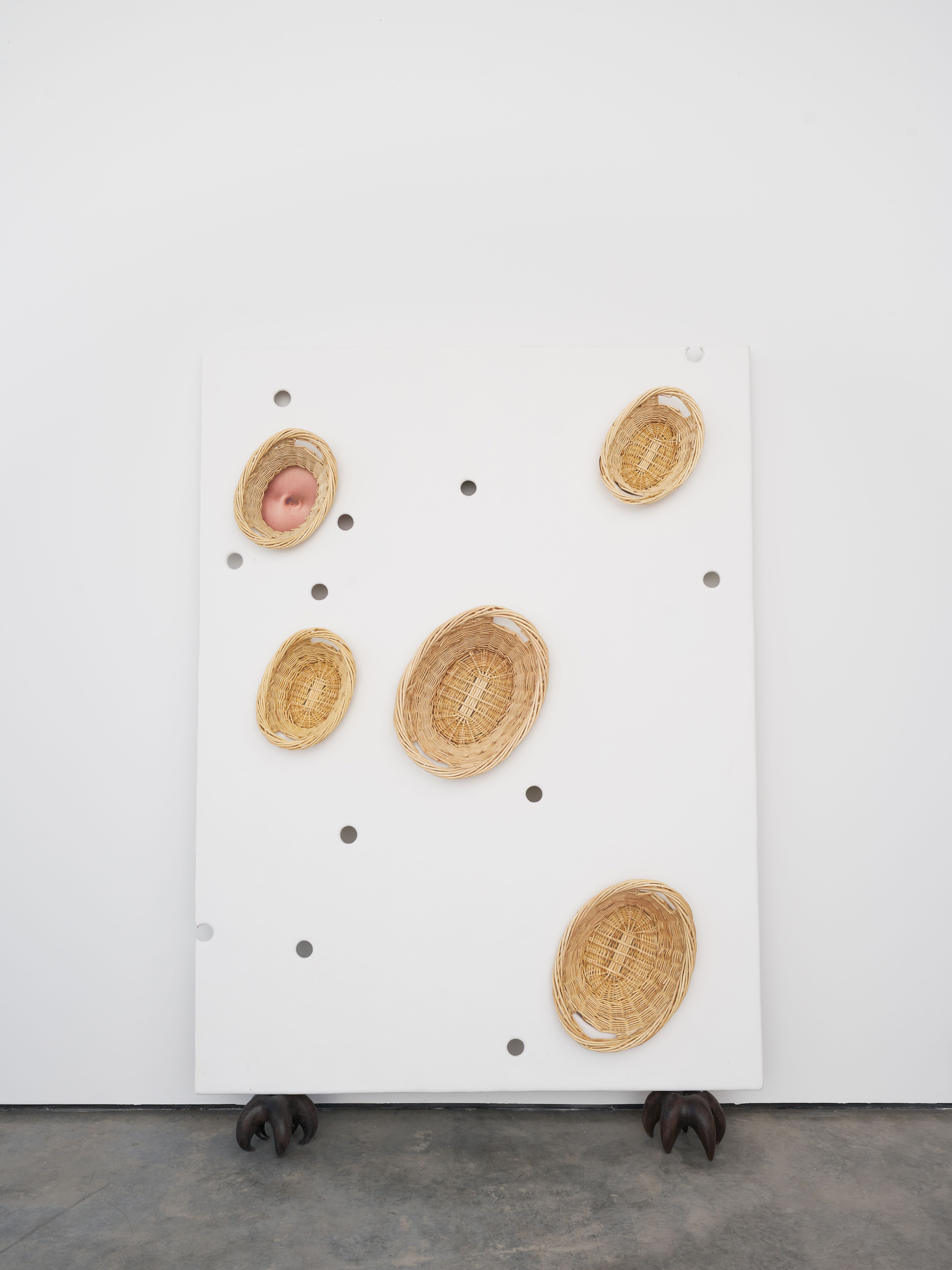 Wholesome takes its name from a recurring triangulation of hole motifs–functional lightening holes, peepholes, and wicker baskets–dispersed throughout this work. Trained as an architect and landscape designer at University of Illinois at Urbana-Champaign, Barger has a keen awareness for interlacement and intention. The absence of matter in the design of an object – from a hole, for instance–alleviates logistical hurdles such as bulkiness or fragility. The embedded baskets, on the other hand, serve as thoughtful counterweights. They can be temporal, rather than spatial, voids during bouts of uncertainty and trouble.