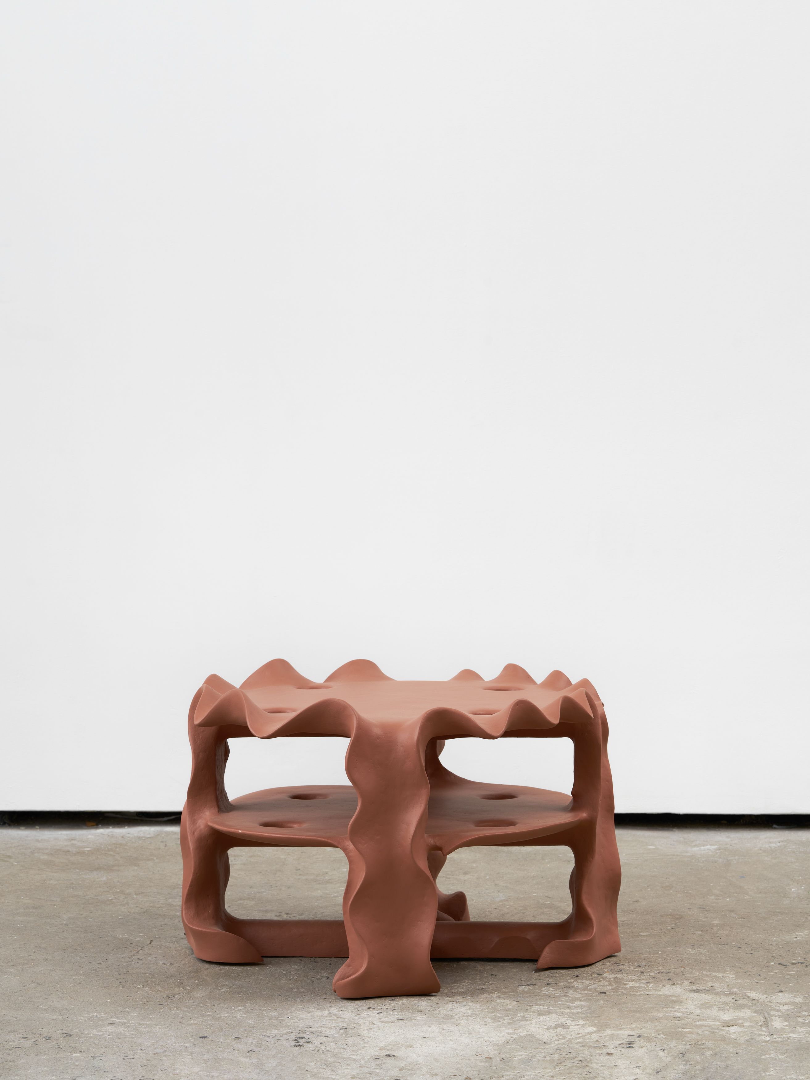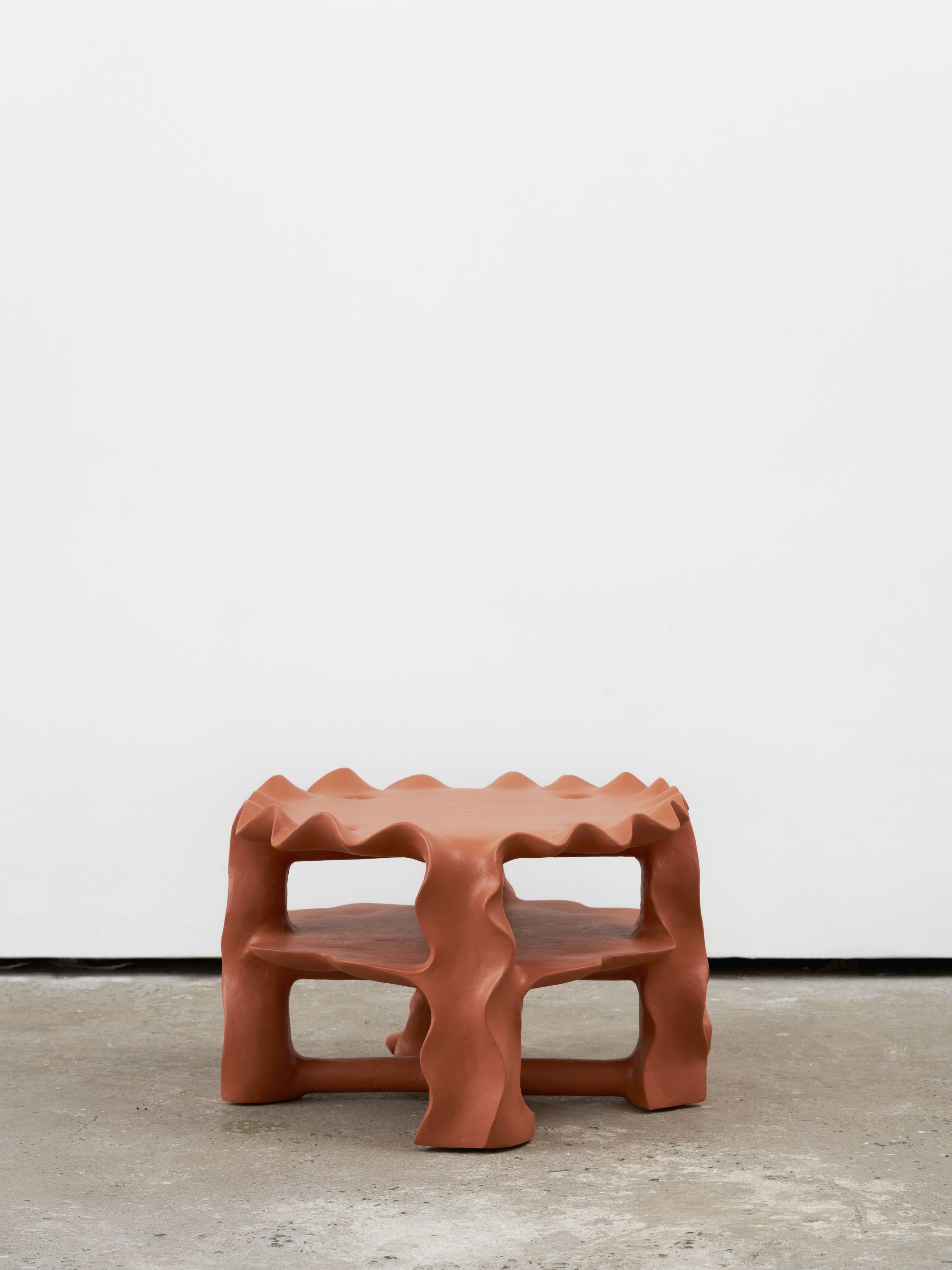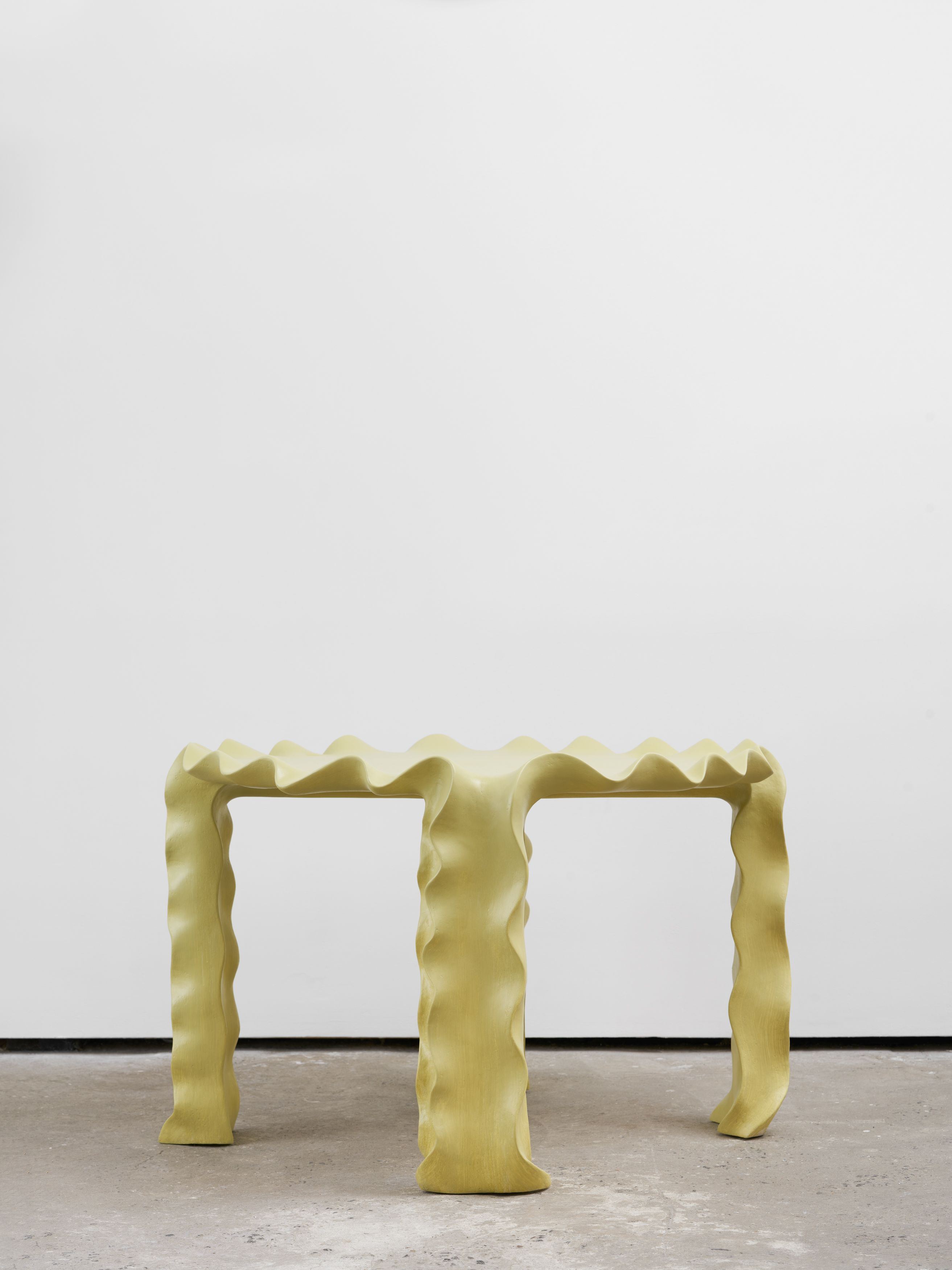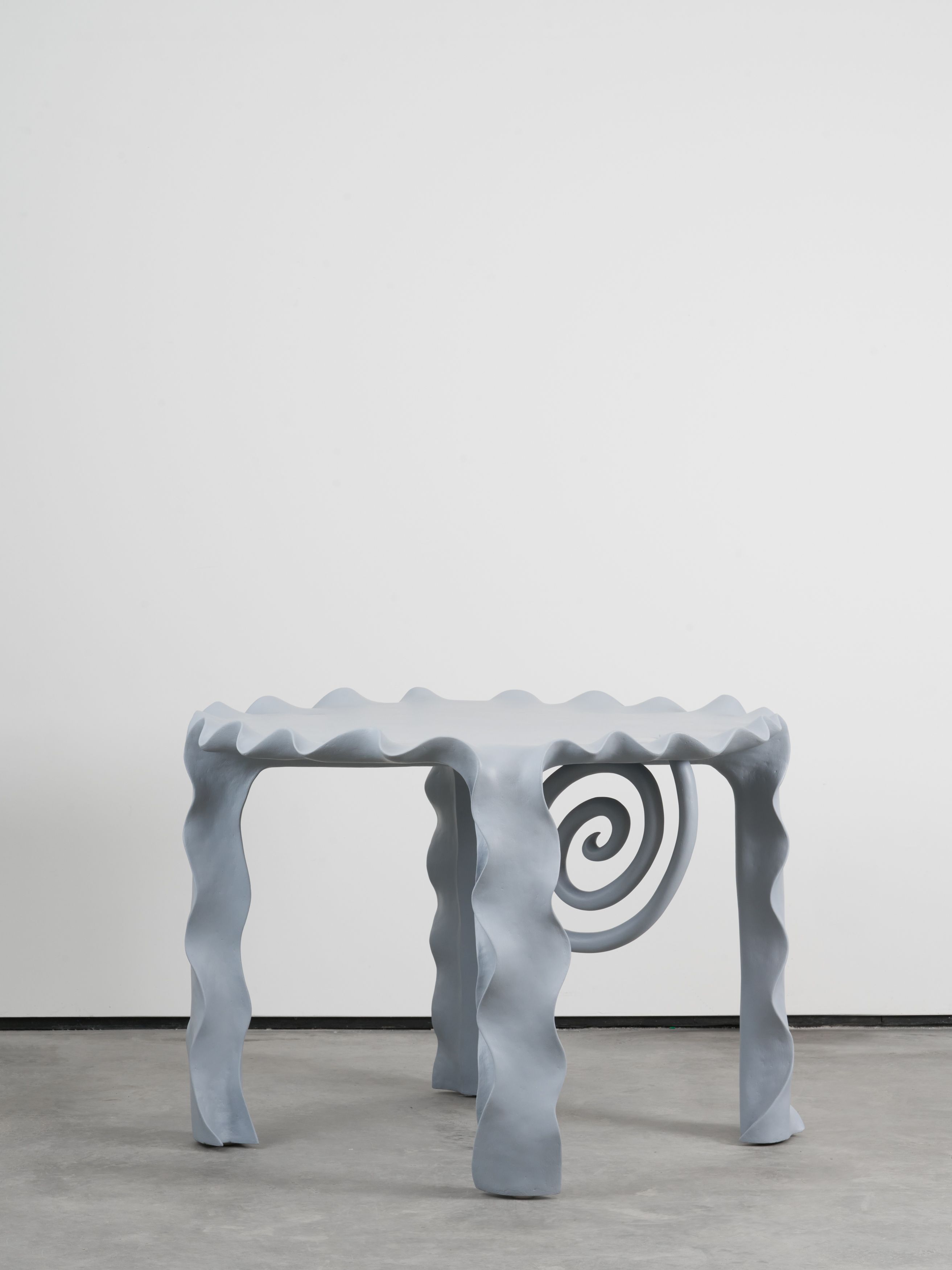 One jumbo-sized footrest differs from the others. Painted ivory, it looks less as a bottom dweller holding the heavy weight of its inconvenient other and more as a table. A patient table. It’s pregnant with possibility, as the saying goes, which seems especially true for most works in Barger’s show. What kind of keepsake would look best resting atop this clawing table? Blooming rosebuds, a basket of fruit, maybe a wool scarf. Near the table are circular, two-tiered coffee tables lined with wavy edges. Called Gray Little Table, they shiver and shake, their legs resembling Mafaldine pasta. Are they boiling in hot air? It’s a thoughtful counterpoise to both the footrest and table claws’ sinister curls.