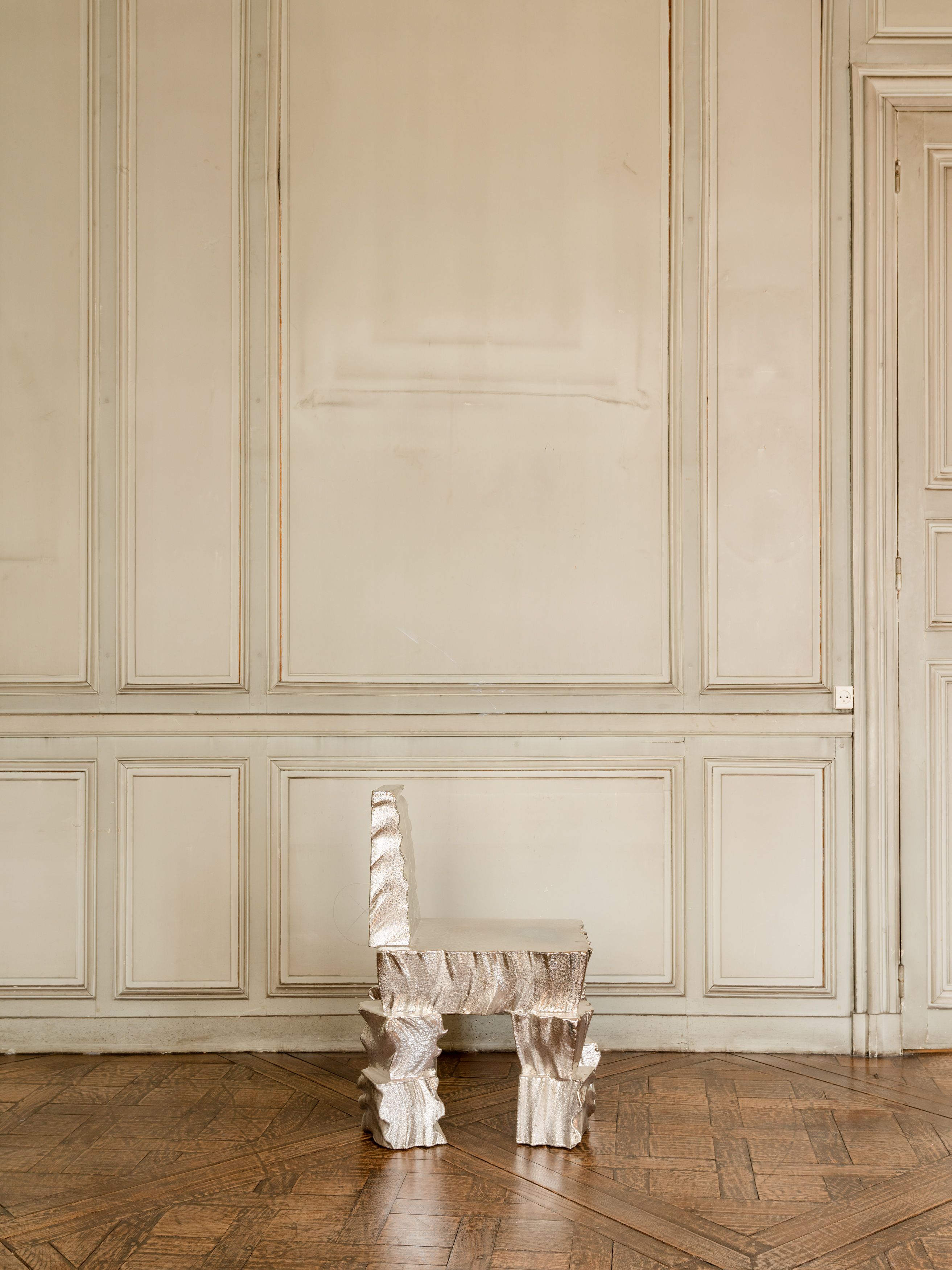 A precise chemical solution of silver nitrate and sodium hydroxide is mixed to make a wet solution which is then applied to the rubber coated poly chair. As the solution dries and settles, silver deposits create a mirrored surface. The contours of the chairs are accentuated by the light reflecting from every angle. Meanwhile the edges of the chair are blurred as its mirrored surface refelcts the surroundings.